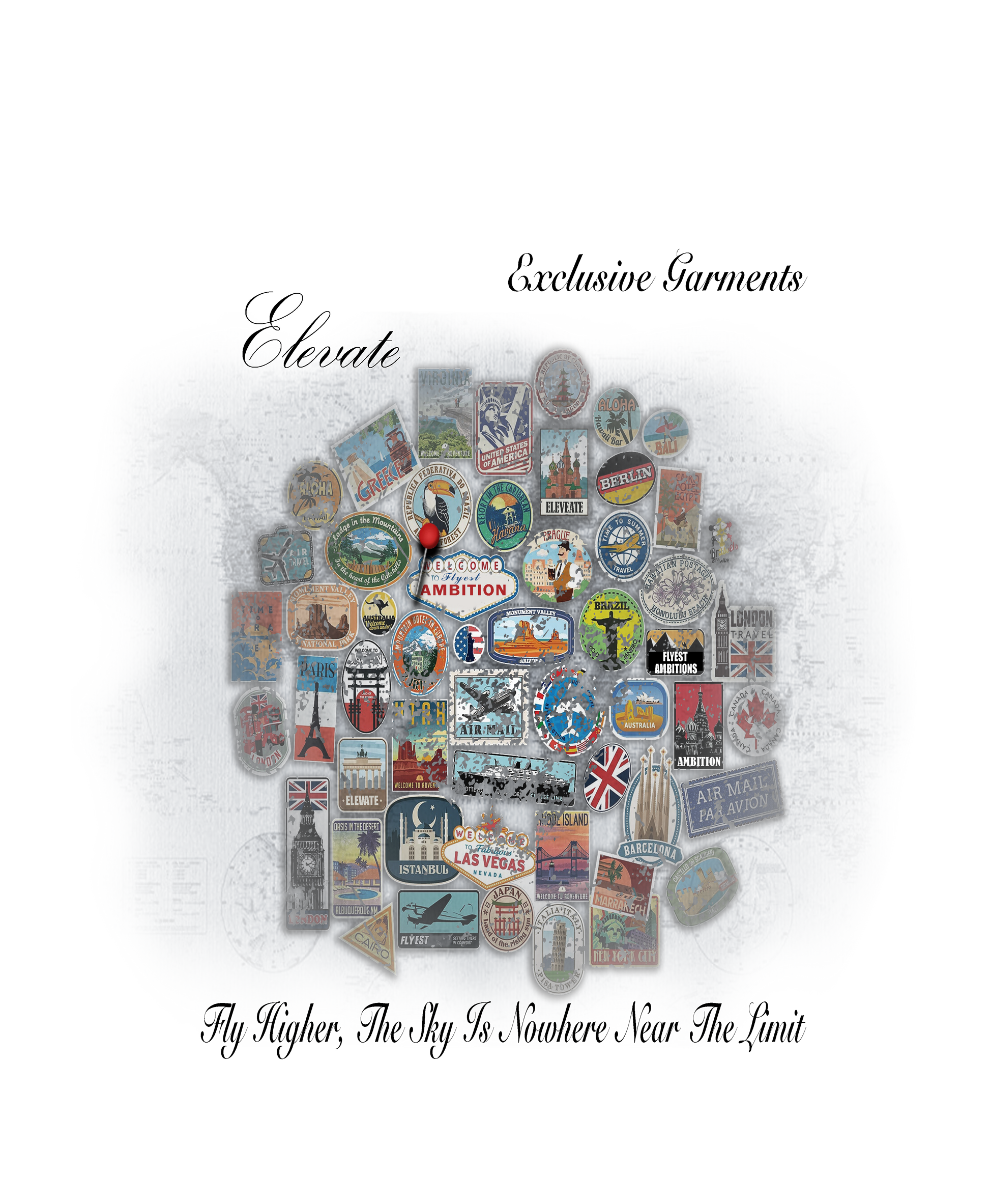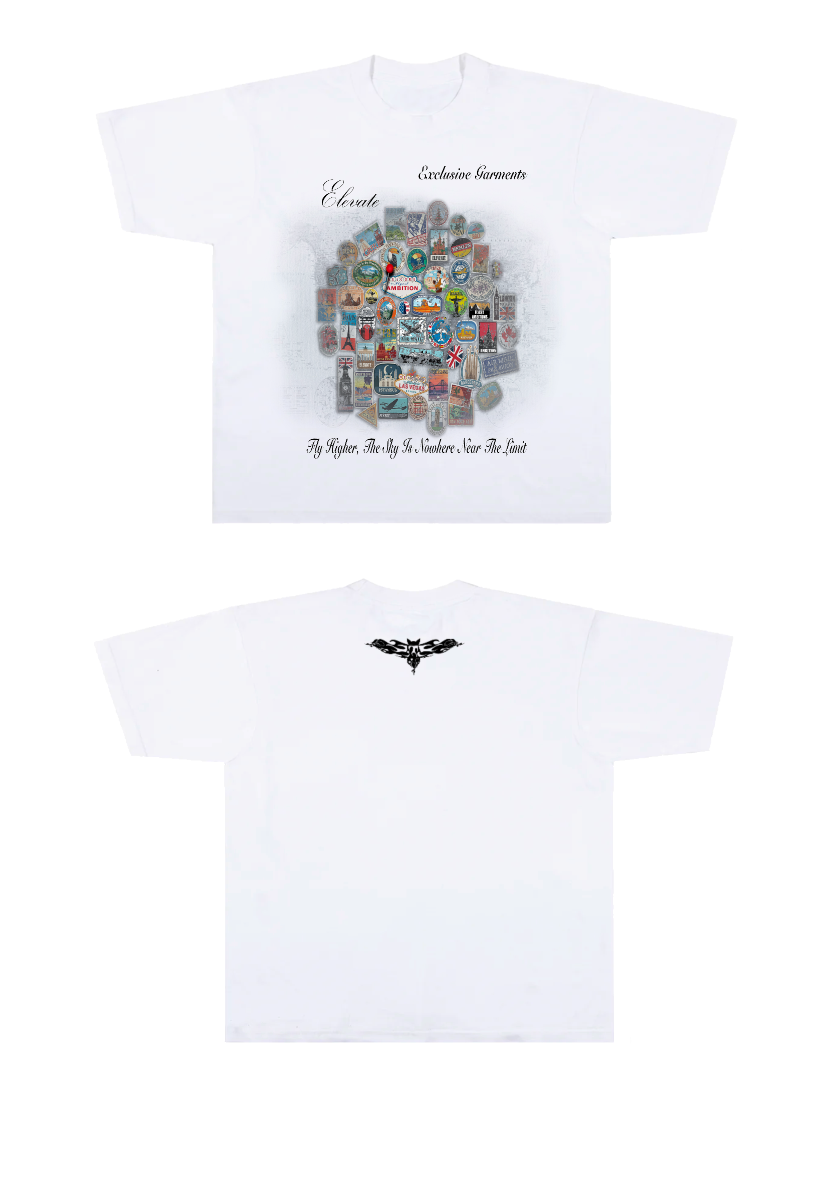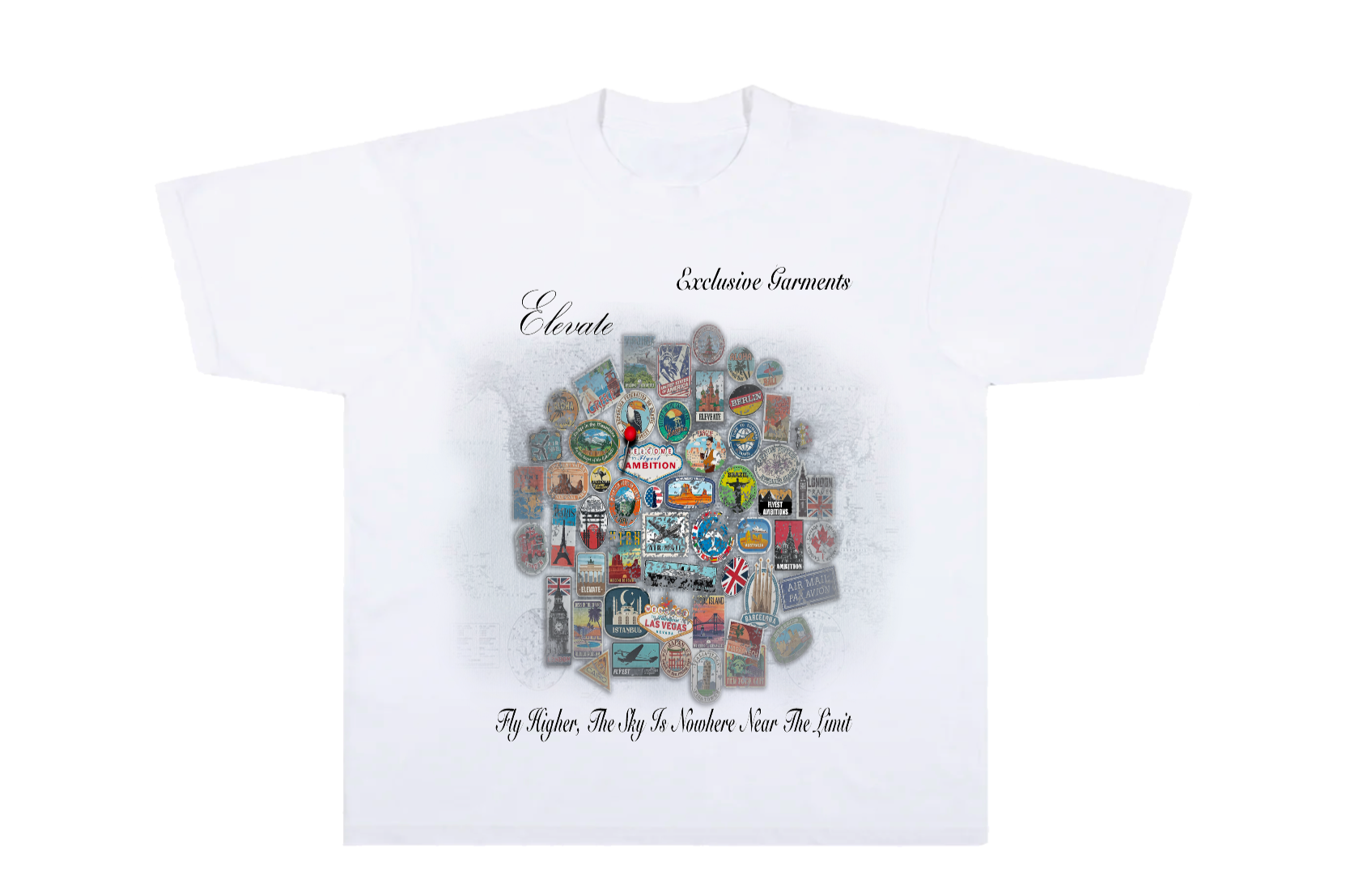 Whit heavy weight graphic tee with travel stamps in the design along with a motivational message that the sky is nowhere near the limit.